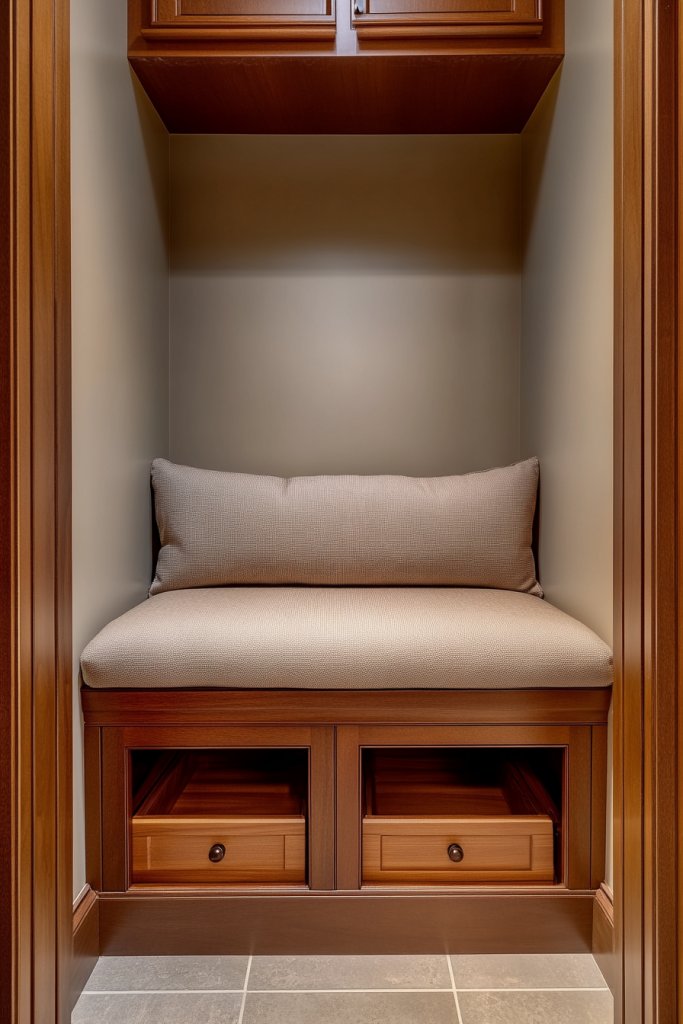 Imagine a small, cushioned bench nestled into a corner, with drawers or baskets underneath for shoes and outdoor gear. The seat is topped with a textured cushion or throw in your favorite fabric—think soft linen or chunky knit. Surrounding the nook, you might add hooks or a small shelf for accessories, creating a layered, homely feel. The space feels intimate and practical.