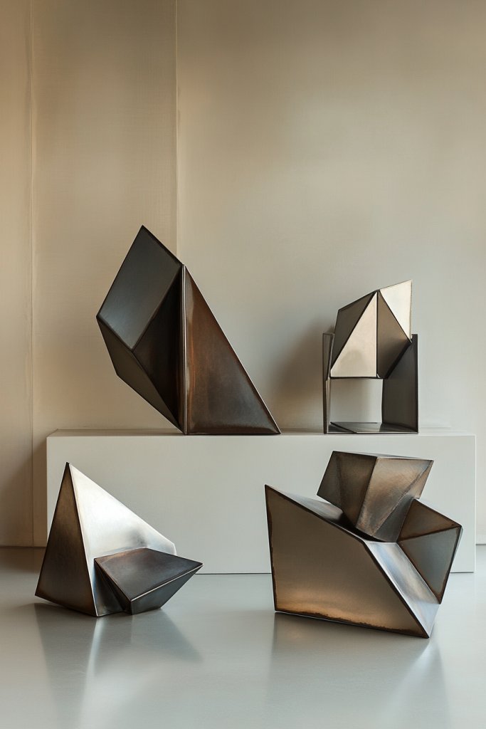 Visualize a wall adorned with large, angular wall sculptures or framed geometric prints in black, white, and metallic tones. Complement this with a sleek console or floating shelf featuring geometric-shaped containers or decorative objects. The interplay of shapes and lines creates visual interest and a sense of movement. Lighting accentuates the sharp angles, adding depth.