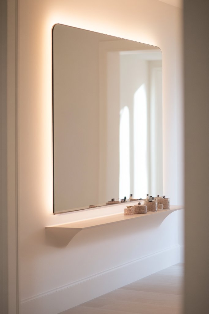 Personalize by selecting decorative objects that reflect your style—ceramic bowls, sculptural pieces, or textured candles. Add a small tray or box on the shelf for keys or loose change to keep things organized. Consider adding an LED strip behind the mirror for a soft glow, creating ambiance and making the space feel luxe.