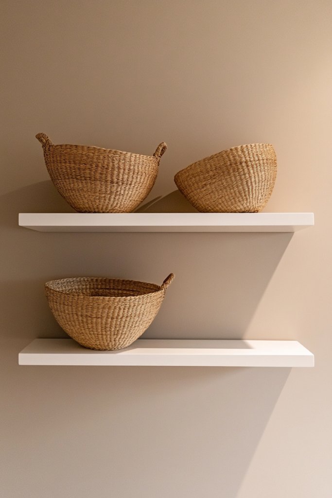 Picture slim, white or wood-toned floating shelves mounted on a neutral wall, holding neatly folded textiles or small decorative objects. Beneath or beside, woven baskets or fabric bins sit on the floor or on the shelves, hiding shoes, scarves, or mail. The combination creates a sleek, organized space that feels calm and curated. It’s a perfect blend of form and function.