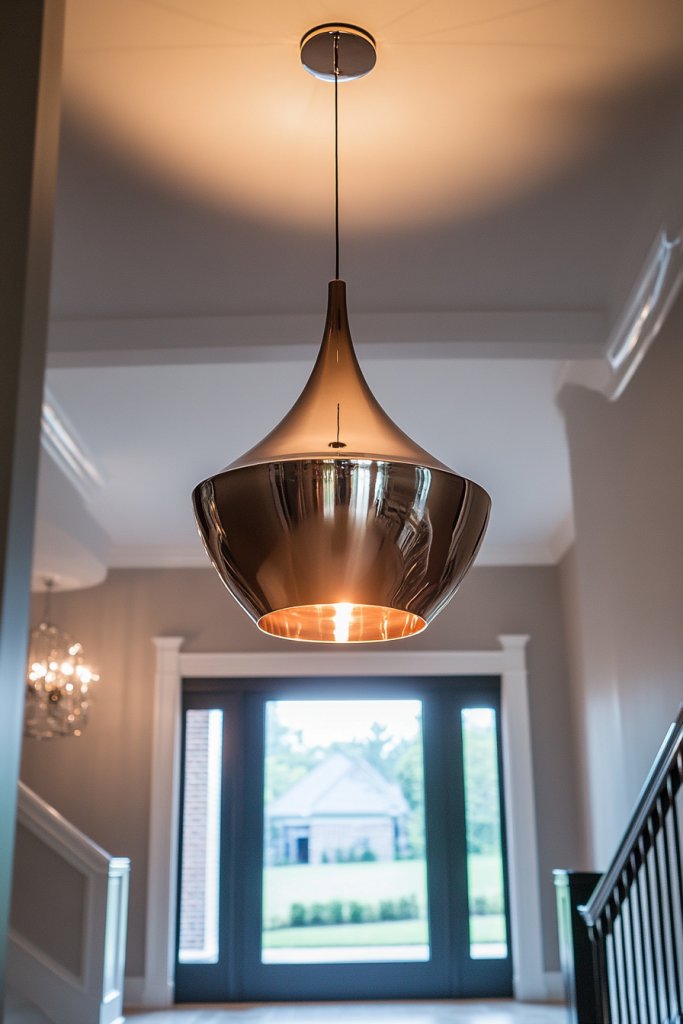 Visualize a large pendant with a warm metal finish—brass, copper, or matte black—hanging directly above the entry. The light’s shape is eye-catching, with a design that complements your decor, whether minimalist, boho, or industrial. The warm glow softly illuminates the entry, highlighting textures and creating a cozy atmosphere. Shadows dance across textured walls, adding depth and interest.