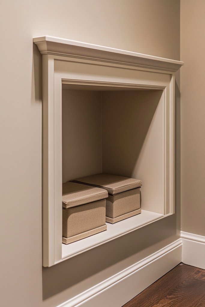 Picture a sleek, recessed space in the wall, framed with simple molding, housing baskets, decorative boxes, or a small sculpture. The niche can be painted in a contrasting color or finished with textured wallpaper to add visual interest. Inside, organize shoes, bags, or keys, making everything easy to access. The surrounding wall remains clean, emphasizing the niche’s custom appeal.