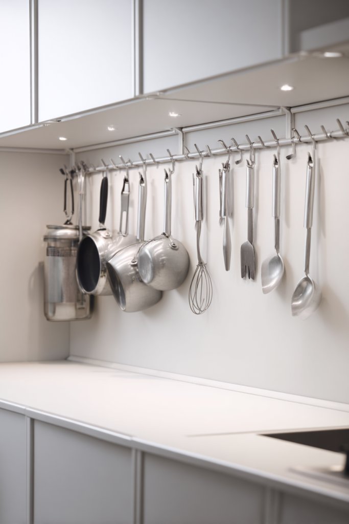 Imagine sleek metal hooks hanging from a painted wall, holding shiny pots and colorful spatulas. Alongside, narrow racks display a collection of hanging ladles and measuring spoons, all within arm’s reach. The textured wall behind adds depth, while the overall layout feels both modern and functional. The space transforms from chaotic to charming, with everything visible and easy to grab.