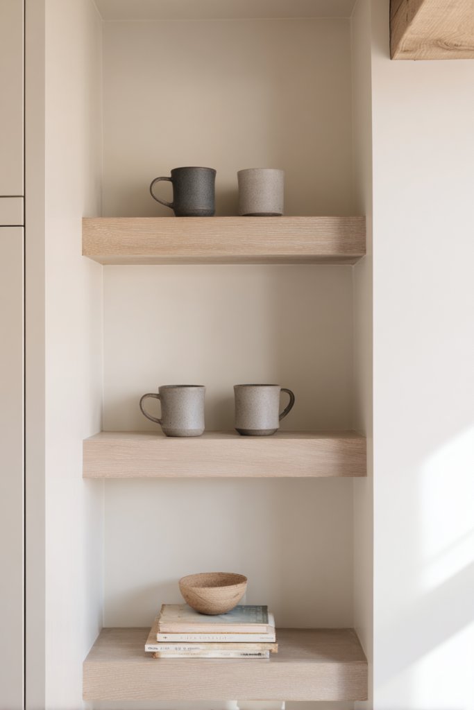 Visualize a row of open shelves mounted on the wall, holding neatly arranged dishes, cups, and bowls. The open design creates a sense of space and accessibility, with everything visible and within reach. Use matching or contrasting dishware to add a pop of color or texture that complements your decor.