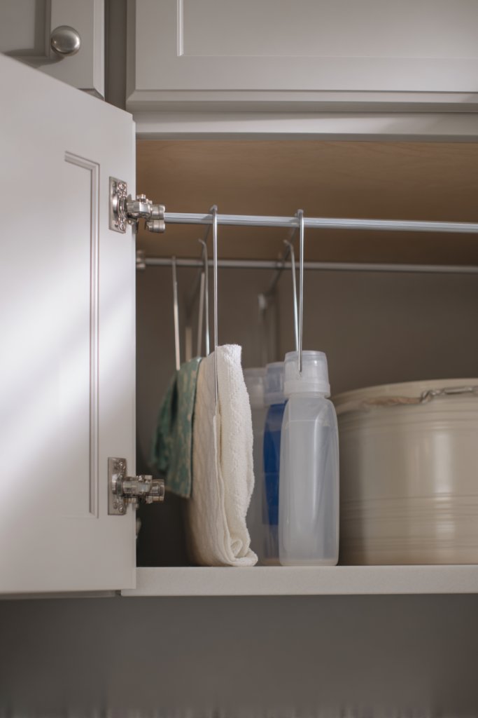 Imagine a sleek metal tension rod stretched across the inside of your cabinet, with spray bottles hanging from hooks or resting on the rod. Rags and scrub brushes are neatly stored on either side, ready for action. The setup keeps everything off the cabinet floor and easy to access, making your cleaning routine smoother.