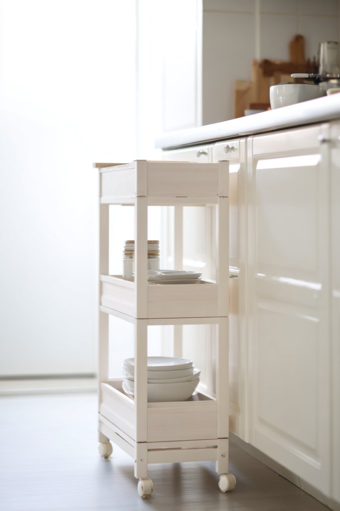 15. Incorporate a Narrow Rolling Cart for Flexible Storage