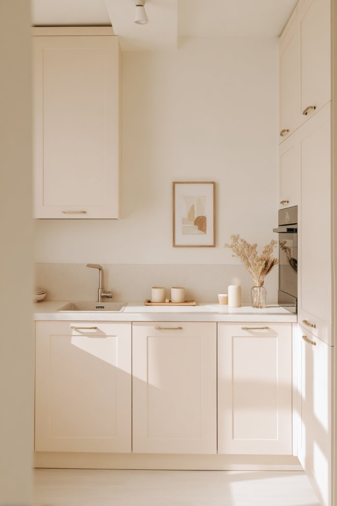 Visualize walls painted in soft neutrals like whites, creams, or pastels, reflecting natural light beautifully. Keep countertops clear of clutter, and choose simple, sleek hardware and fixtures. A few well-chosen accessories, like a soft cream throw blanket with chunky knit texture, add warmth without overwhelming the space. The overall effect is airy, calm, and welcoming.