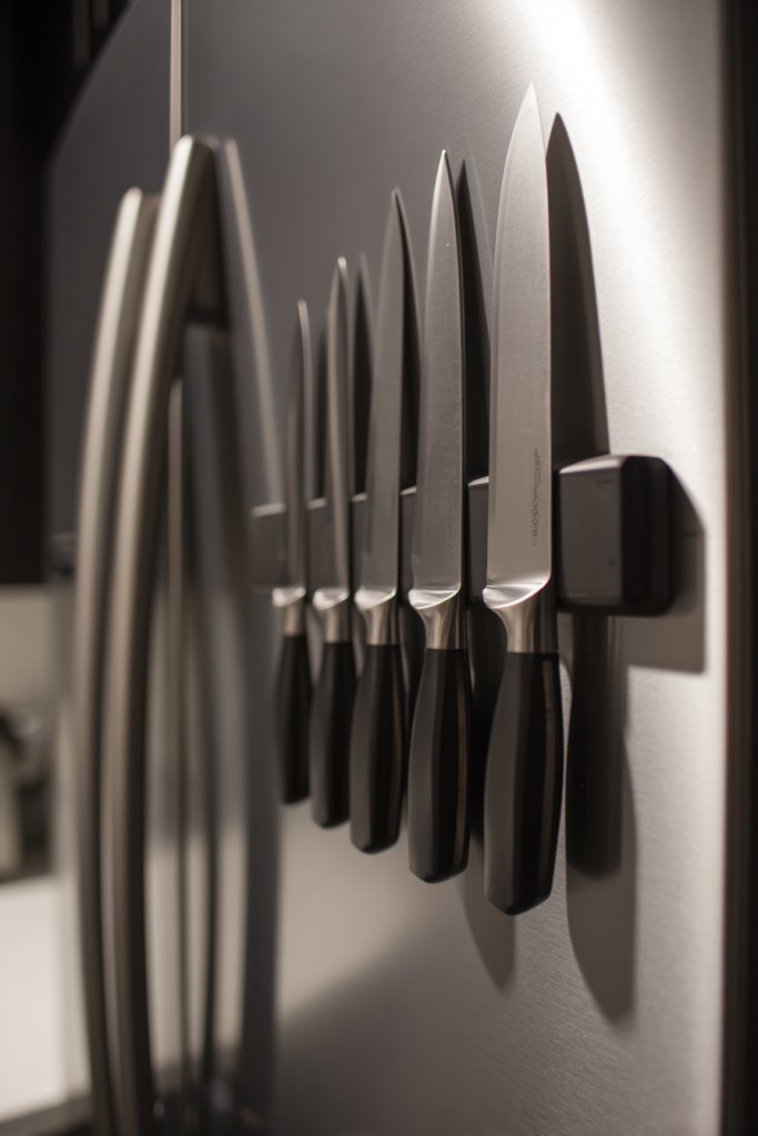 Imagine a sleek magnetic strip affixed vertically on the side of your fridge, with gleaming knives aligned neatly. The strip holds everything securely, and you can quickly grab the right knife without rummaging through cluttered drawers. It’s both practical and adds a modern touch to your kitchen’s aesthetic.