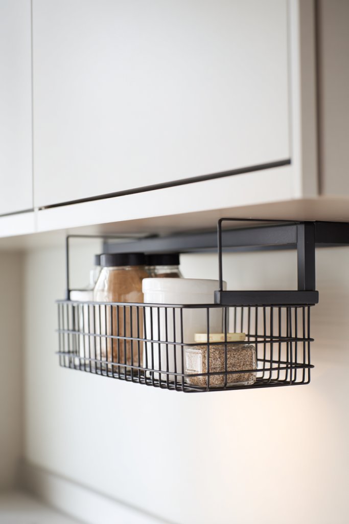 Limited cabinet space often leaves you with cluttered shelves and hard-to-reach items. Under-shelf baskets are a clever way to add extra storage without taking up additional space. They’re perfect for organizing utensils, spices, or small kitchen gadgets.