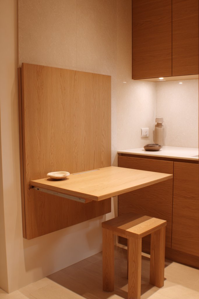Imagine a sleek wall-mounted table that folds down when needed and tucks away flush against the wall afterward. It’s perfect for quick breakfasts or meal prep, and when folded up, the space opens up for movement or other activities. The surface is smooth, with a durable finish, and the hardware blends seamlessly into your decor. It’s like a secret weapon in disguise.