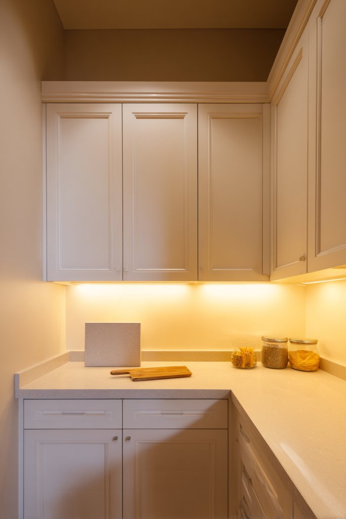 Imagine a strip of warm LED lights installed beneath your upper cabinets, casting a gentle glow over your countertop. The light highlights your chopping, mixing, and plating, making every task easier. The sleek, tape-like fixtures blend seamlessly, adding a modern touch without cluttering your space.