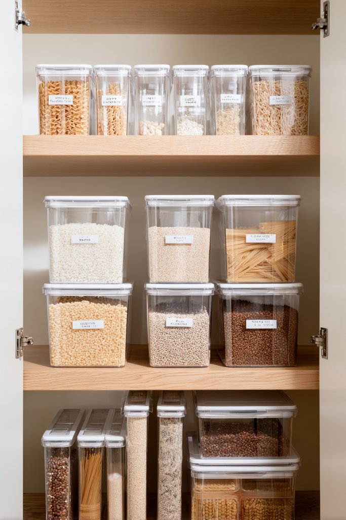 Envision uniform transparent containers neatly stacked on shelves, each labeled with contents like rice, pasta, or snacks. The clear material allows you to see exactly what’s inside, reducing the need to open every box. The uniform shape creates a tidy, streamlined appearance that maximizes space and makes the pantry feel more spacious.
