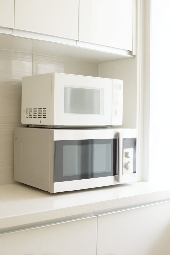 Picture a small microwave stacked atop a mini toaster oven, both fitting neatly on a narrow countertop. A slim coffee maker doesn’t take up much room but brews your favorite morning drink. These units are sleek, with modern finishes, and designed to maximize vertical space, creating a clean, clutter-free surface.