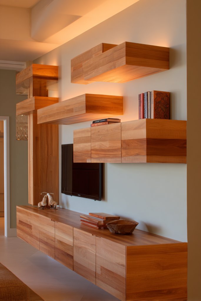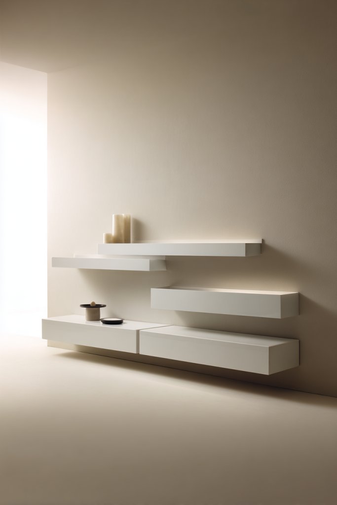 Picture a set of slim, matte-finished shelves floating seamlessly against a soft-colored wall. Behind a discreet panel, media devices and cables are tucked away, leaving only clean lines visible. The shelves hold a few curated decor pieces, like a textured ceramic bowl or a stack of sleek books, adding personality without clutter. Soft LED strips under each shelf cast a warm glow, creating a cozy ambiance. Everything feels organized, modern, and effortlessly elegant.