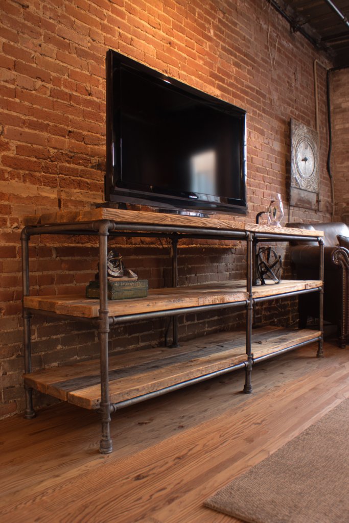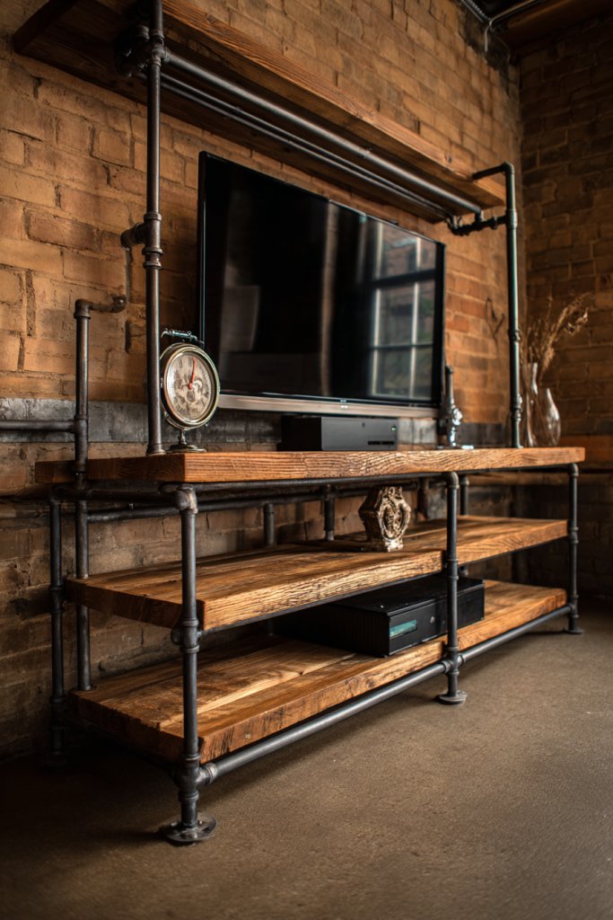 Visualize a sturdy black metal pipe frame, reminiscent of old factory fixtures, supporting wide wooden shelves with a weathered finish. The open design allows easy access to media devices and decorative objects, while the industrial aesthetic adds a raw, authentic vibe. The exposed pipes and distressed wood combine to create a piece that’s both functional and full of character. It’s like bringing a piece of the city into your home.
