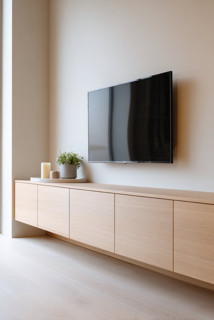 Imagine a slim, wall-mounted cabinet with a smooth matte finish and handleless doors, floating effortlessly against a neutral wall. Inside, hidden compartments store your media gear, remotes, or cables, leaving the exterior pristine. The minimalist design ensures the focus stays on your TV and decor accents, while the concealed storage keeps everything tidy. The subtle elegance adds sophistication without clutter.