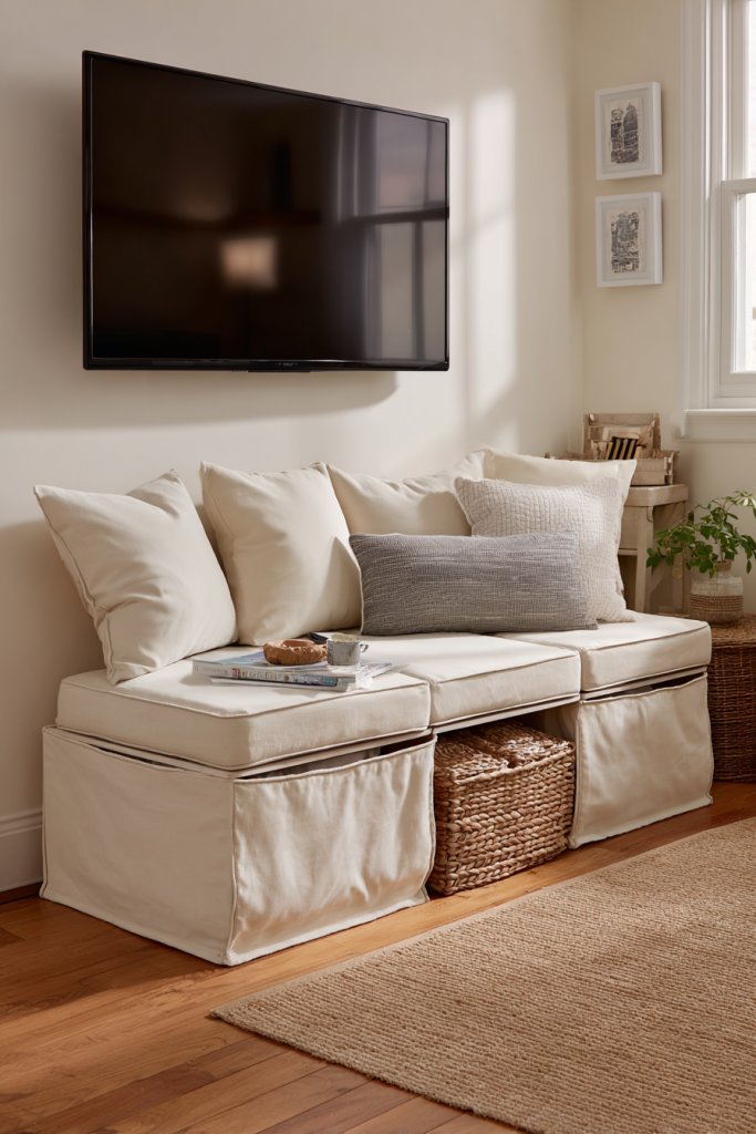 Add personal touches like a soft cream throw blanket with chunky knit texture or pastel cushions to enhance the cozy vibe. Incorporate textured storage baskets or fabric bins inside the cabinets for organization. Swap out decorative objects seasonally—think soft ceramics or woven accents. Keep the overall aesthetic light, airy, and functional.