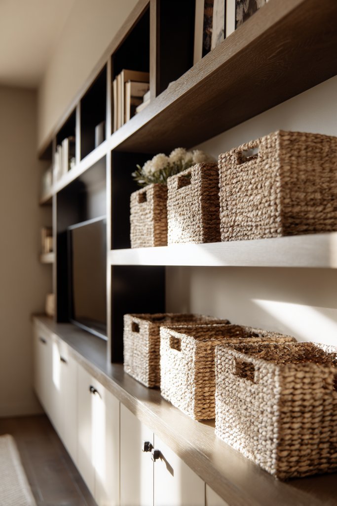 Personalize with textured baskets that reflect your style—woven, fabric-lined, or colorful. Add a few decorative objects like small sculptures, candles, or framed photos on the shelves for personality. Change out baskets seasonally or when you want a fresh look. The goal is a clutter-free, inviting space that feels curated and cozy.