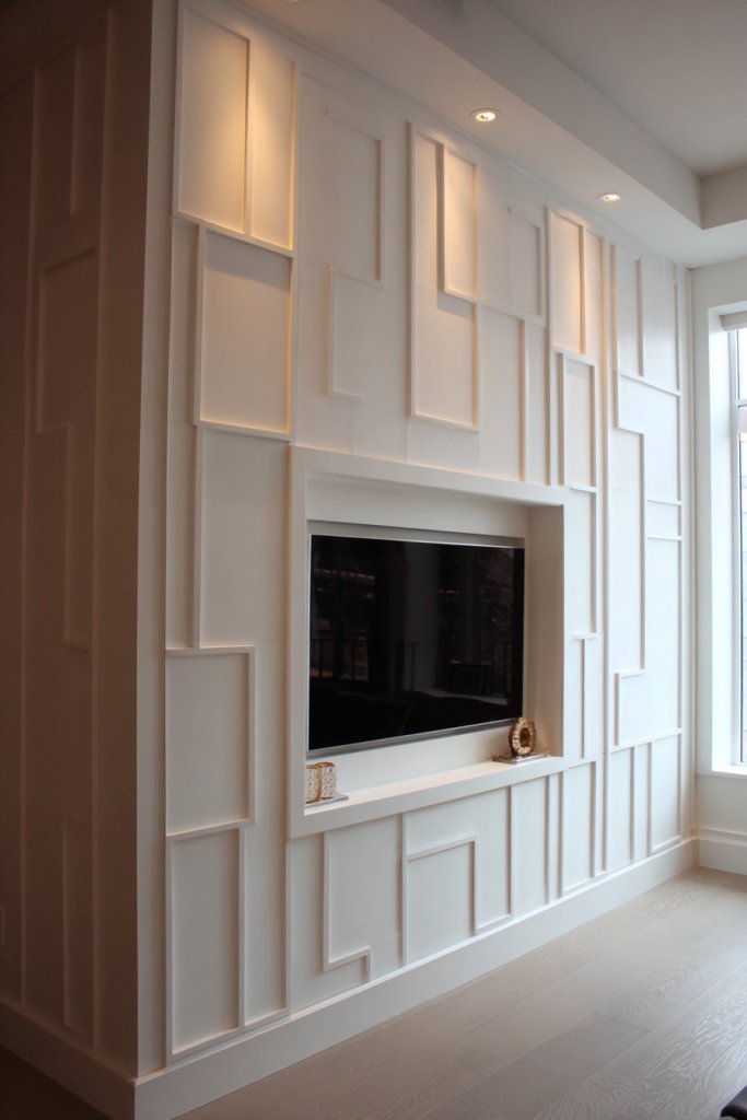 Want a feature wall that’s both functional and visually stunning? Modern wall paneling with a built-in media niche offers a sophisticated solution that elevates your entire living space. It combines texture, depth, and purpose, making your TV setup look like a custom piece of art. Plus, it minimizes clutter and defines your media area beautifully.