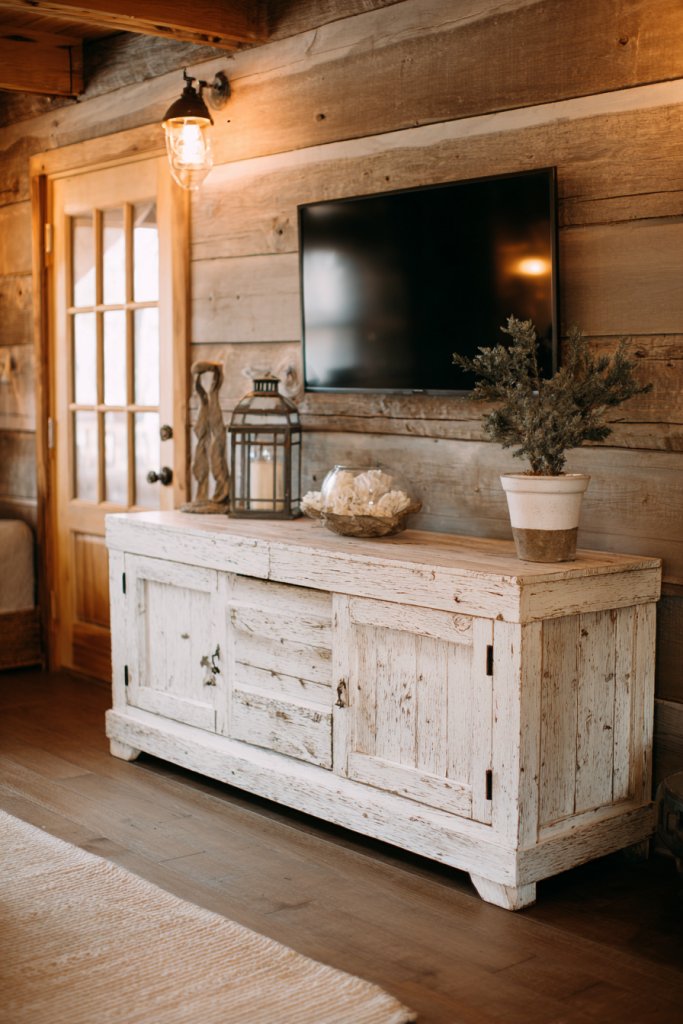 Choose a sturdy wooden piece with multiple storage options or build your own using reclaimed wood. Finish with a whitewash technique if customizing, or purchase pre-finished furniture. Position it against a wall with good natural light, and arrange media devices inside with proper cable management. Decorate with vintage-inspired accessories like metal lanterns or soft textiles nearby. Keep the look authentic with imperfect finishes and simple hardware.