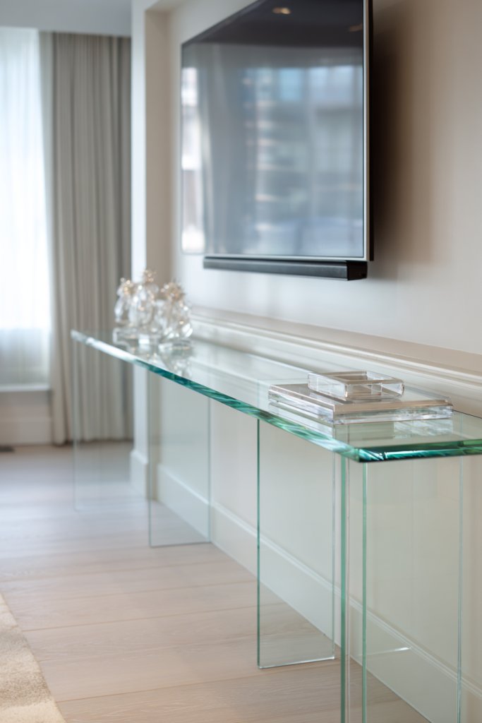 Opt for clear tempered glass for a high-end look, or tinted or frosted glass for a softer effect. Metal legs can be in black, gold, or chrome, depending on your style. Keep accessories minimal—perhaps a small sculptural object or a textured box. Seasonal updates include changing textiles or adding decorative accents that complement the overall aesthetic.