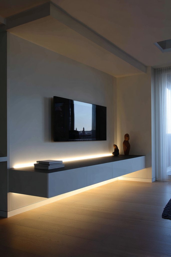 Envision a streamlined cabinet floating just above the floor, painted in a neutral shade or finished in sleek lacquer. LED strips run along the underside, emitting a soft glow that highlights the floating design. The open shelves or compartments display your media gear, books, or decorative objects, all illuminated by the subtle lighting. The overall effect is a contemporary, warm, and inviting focal point that draws the eye.