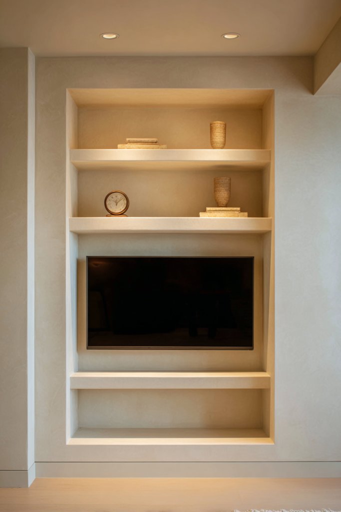 A built-in wall niche with surrounding shelving elevates your space and adds architectural charm. It proves that media setups can be both functional and beautiful, blending seamlessly with your overall interior style. Once complete, it transforms your TV area into a sleek, integrated feature that feels custom-designed. Ready to impress with a wall that’s as smart as it is stylish?