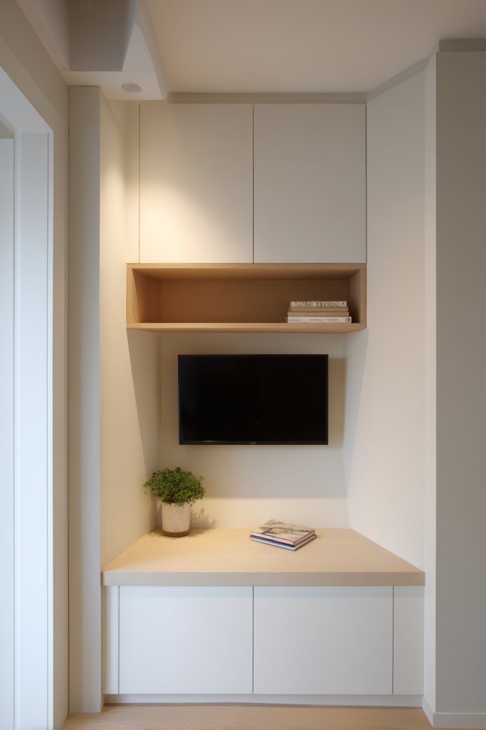 Imagine a sleek wall panel with a fold-down surface that transforms into a workspace when needed. When folded up, it reveals a streamlined TV unit with hidden compartments or shelves for media devices. The design is minimal, with clean lines and a neutral finish, blending in with your decor. The space feels open and uncluttered, ready for both relaxing and productivity.