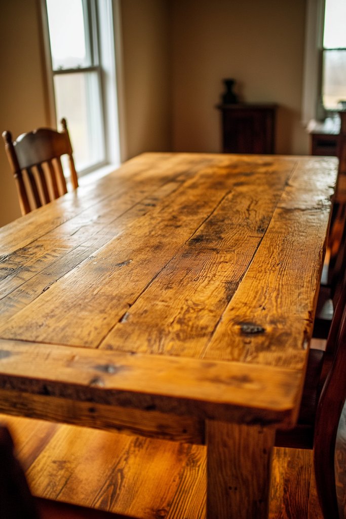 Picture a sturdy, weathered table with a rough-hewn surface, showing off knots and natural imperfections. The rustic finish adds depth, with a soft matte sheen that highlights its history. Surround it with mismatched vintage chairs, and suddenly your dining area oozes charm. The smell of aged wood and the tactile feel of its textured surface evoke nostalgia and comfort.