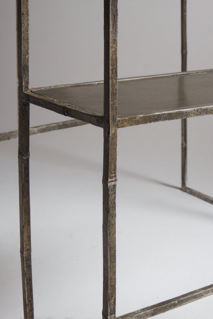 Picture a metal shelving unit with a distressed, matte finish or a bamboo room divider with visible joints and natural imperfections. The open-frame design keeps the space feeling airy and uncluttered, while the worn finishes add a layer of history. These elements blend seamlessly with soft textiles and muted tones, creating a layered, textured environment that feels both modern and rustic.