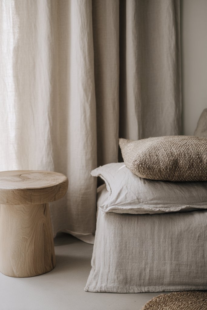 Use floor cushions in neutral or earthy shades, layered with textured throws for comfort. The side table can be a simple wooden stool, a vintage crate, or a handcrafted ceramic piece. Add seasonal touches like a wool blanket or a textured cloth to shift the mood. Keep the space minimal, focusing on quality and simplicity.