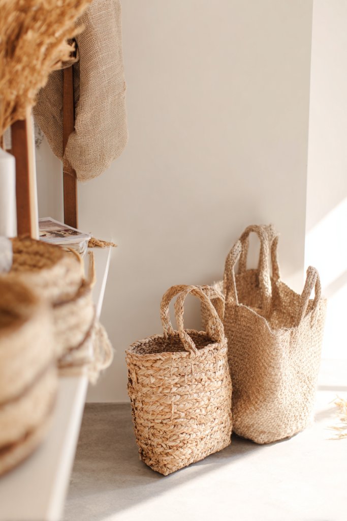 Choose natural fiber baskets or sacks from local artisans or eco-conscious brands. Use them to corral clutter in a visually appealing way. Securely place or hang them to avoid tipping or falling. Regularly clean and fold or rearrange to keep the look fresh. Incorporate them into your overall decor by matching their tones with other natural elements.