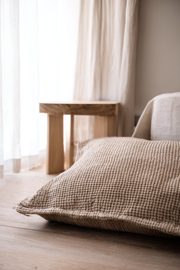 Imagine a soft, textured cushion in muted tones placed on a natural fiber rug. A small wooden or ceramic side table sits nearby, holding a handmade cup or a textured ceramic bowl. The space is uncluttered, with a few carefully chosen objects that evoke tranquility—perhaps a stone or a dried botanical. The overall vibe is cozy, grounded, and intentional.