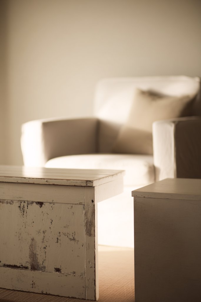 Picture a simple wooden side table with a worn finish, showing patches of raw wood where paint has chipped. A sleek metal chair with scratches and patina sits nearby, exuding a quiet strength. These pieces look like they’ve been part of a life well-lived, adding depth and warmth to your decor. Their imperfections make the space feel genuine and lived-in.