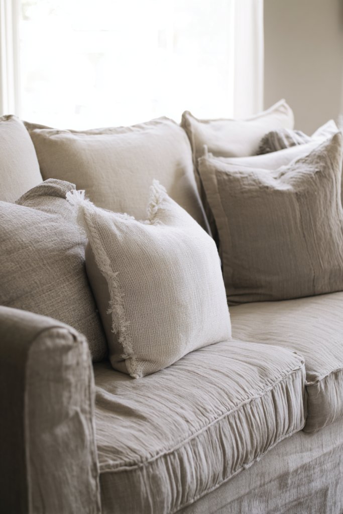 Imagine a soft, cream-colored linen sofa with natural linen texture visible under the light. Toss in cushions in muted taupe and warm beige, with subtle weave patterns that add depth. The fabric’s understated variations create a sense of movement, making the furniture look effortlessly inviting. The overall palette keeps the space calm, balanced, and timeless. It’s like wrapping yourself in a cozy, quiet embrace.