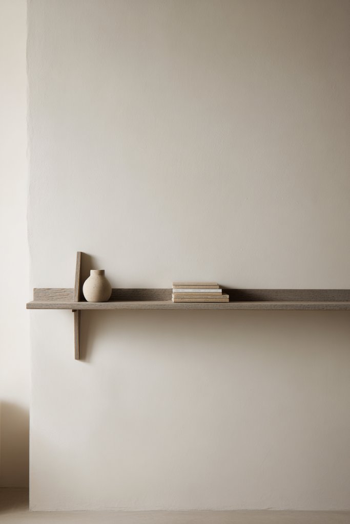 Envision thin, matte-finished wooden shelves mounted close to the wall, holding curated collections of handmade ceramics, books stacked horizontally, and small sculptural objects. The low profile keeps the eye focused on the room’s overall harmony. The shelves blend seamlessly with neutral wall tones, adding subtle architectural interest. The open design invites visual flow and easy access to stored items.